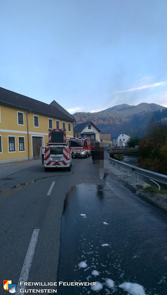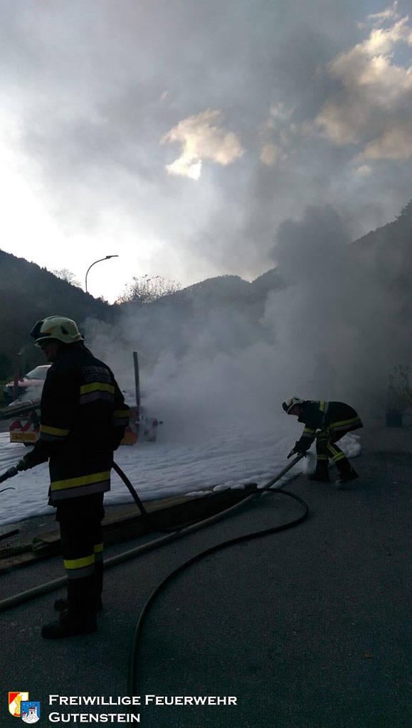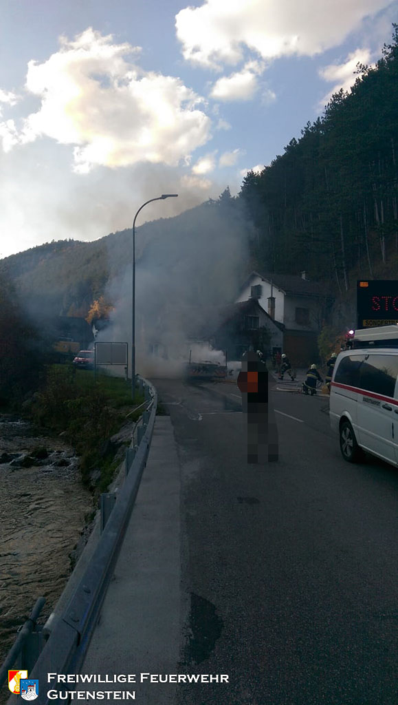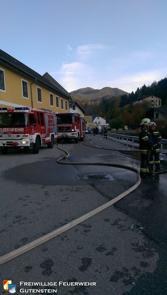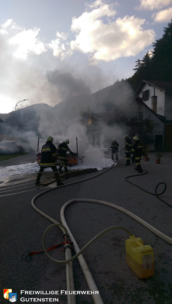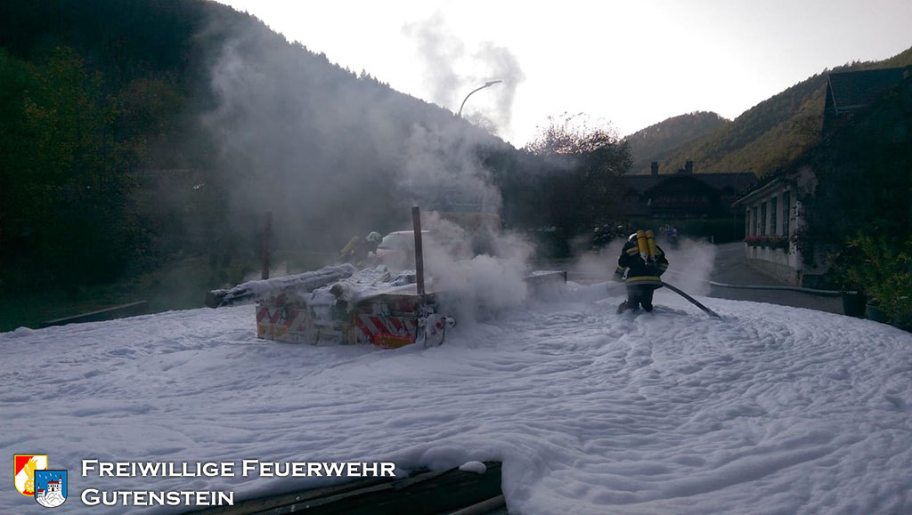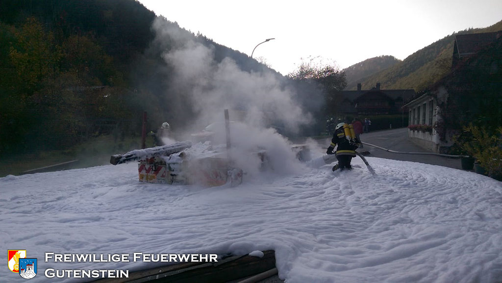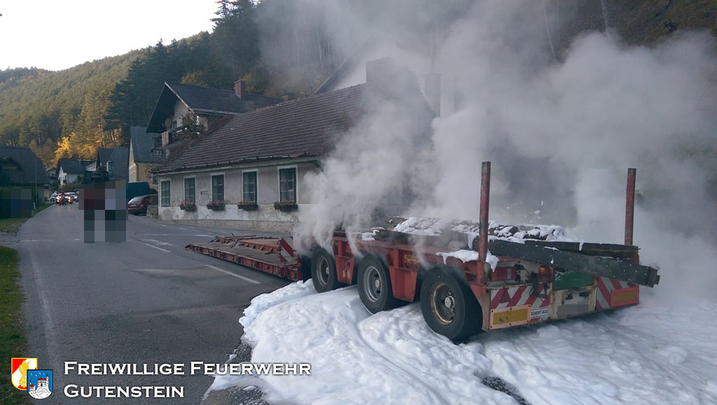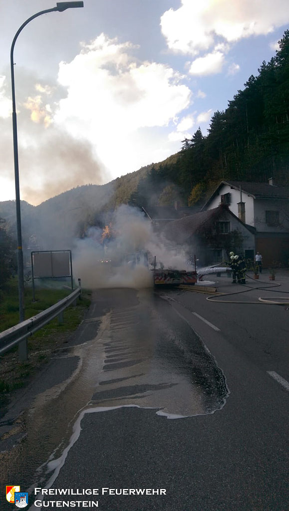Gemeinsam mit der FF Pernitz wurde die FF Gutenstein am 16. Oktober um 16.22 Uhr, mittels Sirene und Pager, zu einem Brand eines Tiefladers in die „Hegerkurve“ alarmiert. Innerhalb weniger Minuten rückte die FF Gutenstein mit TLFA, KRFA und VFA zum Fahrzeugbrand aus.