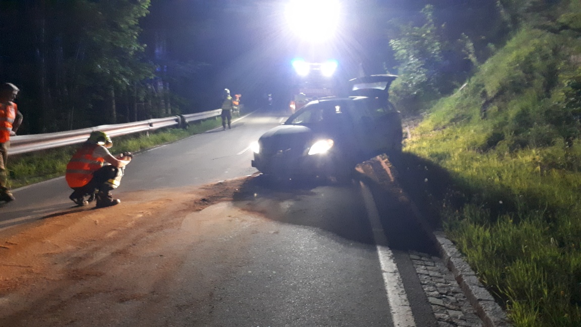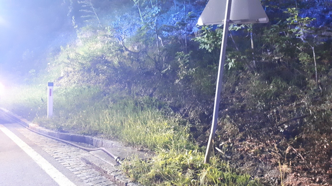 Ein Pkw kam aus bislang ungeklärter Ursache von der Fahrbahn ab, riss sich die Ölwanne des Motors an einen Felsen auf und verteilte das gesamte Motoröl auf der Böschung bzw. Strasse.