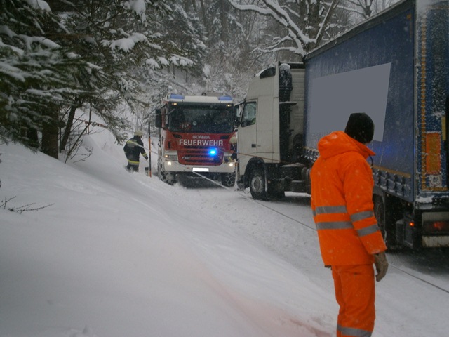 Am 17.01.2013 um 11:43 Uhr wurde die Feuerwehr Gutenstein mittels Stiller Alarmierung (Pager, SMS) zu einer LKW Bergung in das Klostertal gerufen. Gleich darauf verständigte ein Passant Kommandant Gamsjäger über die Lage! Der Einsatzleiter ließ unverzüglich von Florian Wiener Neustadt die FF Nasswald zur Unterstützung alarmieren. Beim Eintreffen am Einsatzort bot sich folgende Lage: Ein LKW blieb vermutlich aufgrund der tiefwinterlichen Straßenverhältnisse bei einer Steigung hängen. Weiters versuchte der Lenker seinen LKW zurückzusetzen, dabei dürfte ihm auf der rechten Seite die Straße ausgegangen sein, sodass er mit der Zugmaschine in den Straßengraben rutschte. Der Sattelaufleger stand quer über die L 134.
