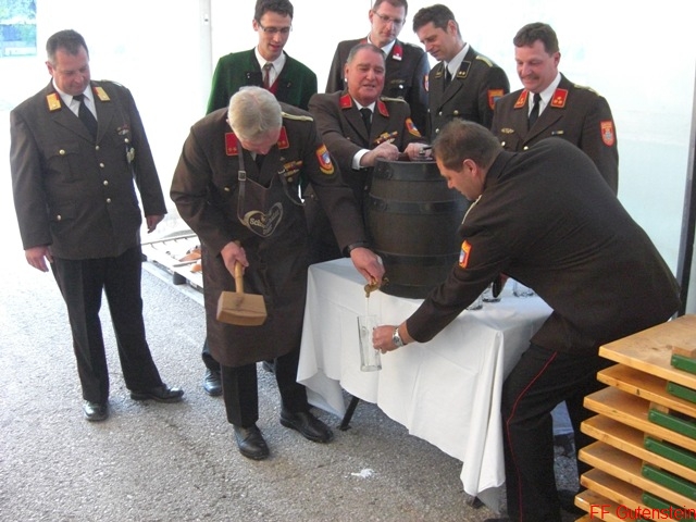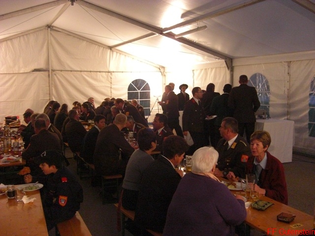 Zum Schluss wurden die Florianijünger von der Musik in das Gastrozelt der Festspiele Gutenstein geleitet. Im Zelt wurde von BGM EOBI Seper Johannes der Bieranstich vorgenommen. Das Trinken wurde von der Mannschaft „Cafe Nelly“ serviert. Das Essen wurde vom „Gasthof Bergmann“ als Buffet aufgebaut.