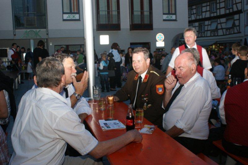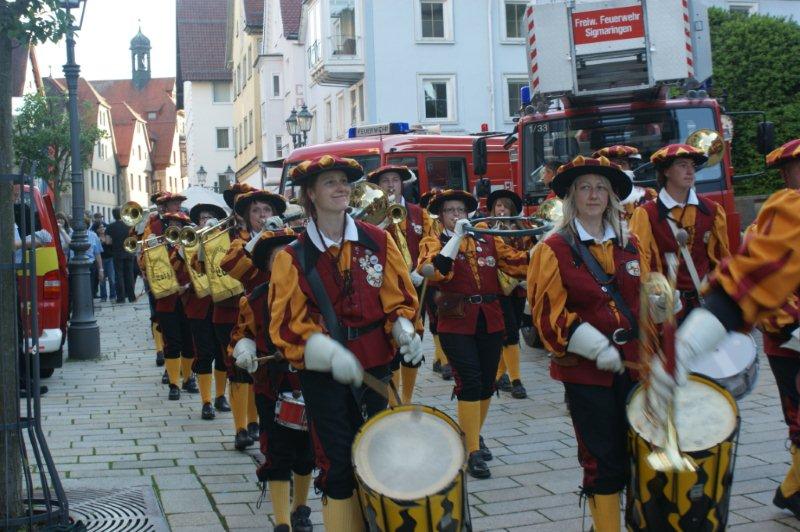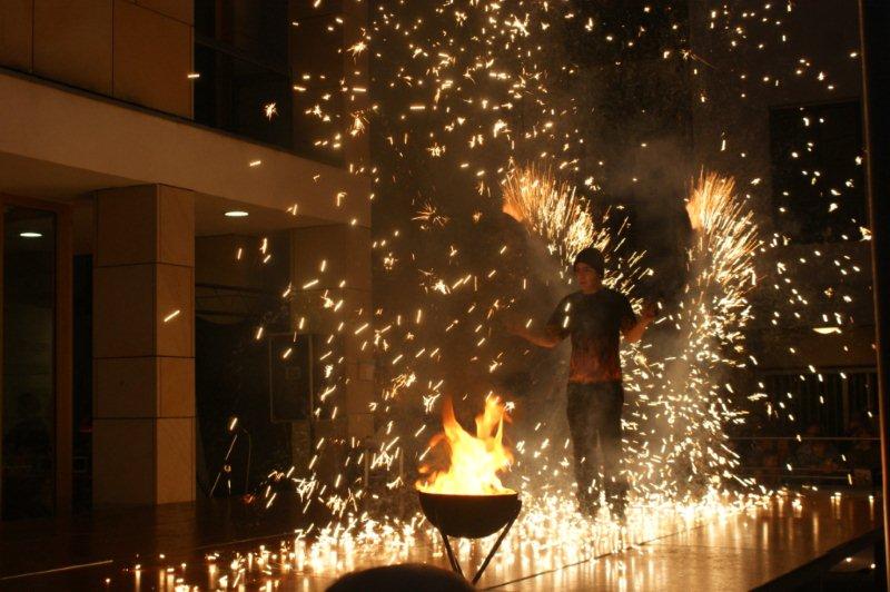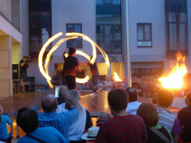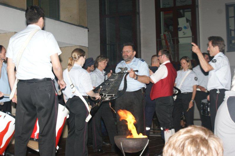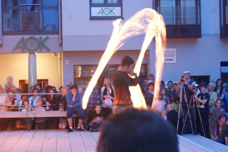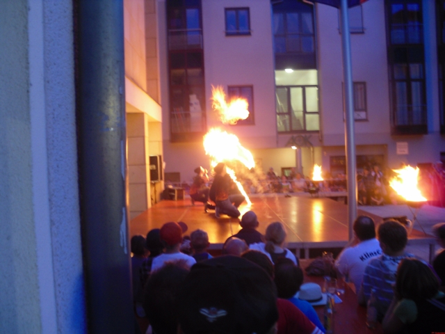 Der späte Nachmittag, bzw. Abend stand im Zeichen der vielzähligen Spielmanns- und Fanfarenzüge. Die Nacht dagegen stand im Zeichen des Feuers. Auf der Bühne vor dem neuen Rathaus wurde eine famose Feuershow geboten, welche bis spät in die Nacht dauerte.