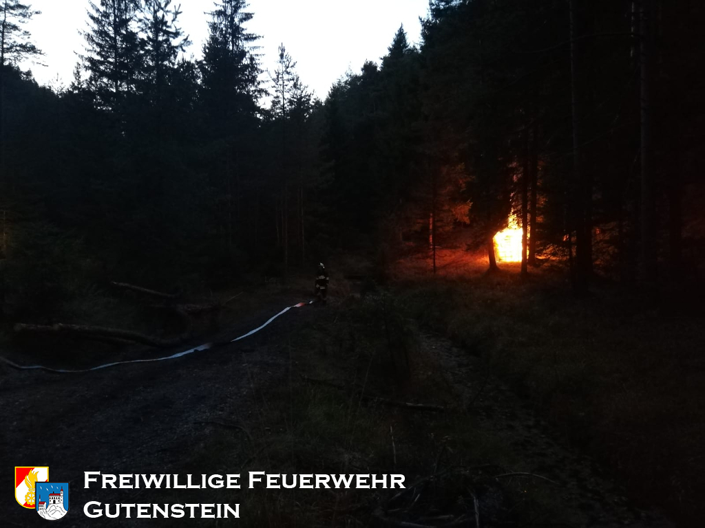 Übungsannahme: Brand eines Hochstandes mit übergreifen des Feuers auf den angrenzenden Wald, ein PKW stürzte in das Bachbett, darin befanden sich zwei verwirrte Personen.