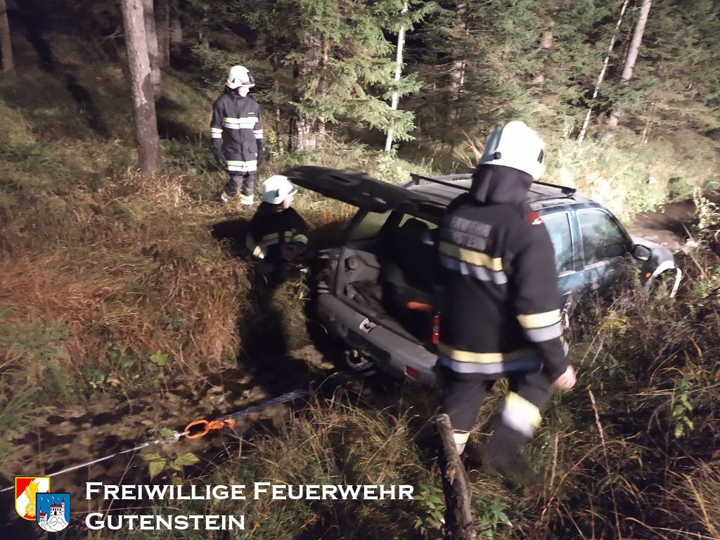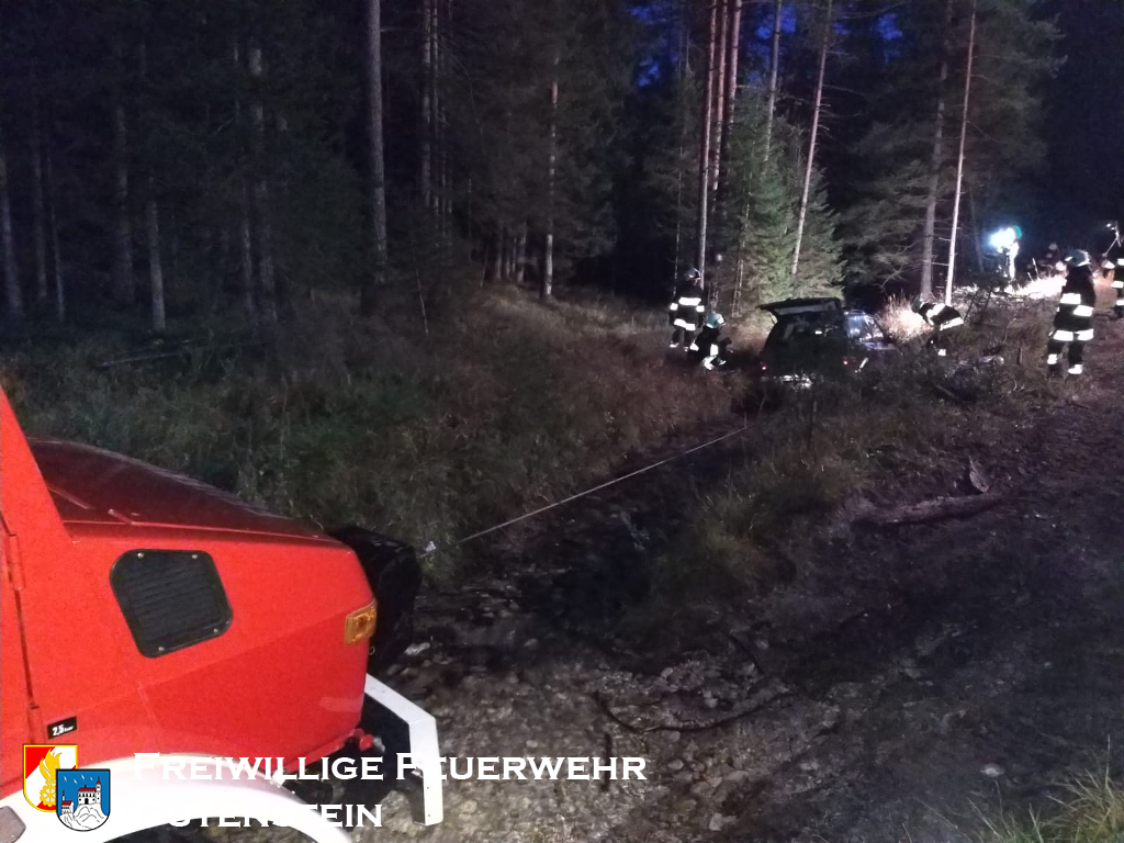 Nach ablöschen des Feuers und Versorgung der Personen wurde das Fahrzeug aus dem Bachbett mittel Seilwinde von LF geborgen und sicher abgestellt.